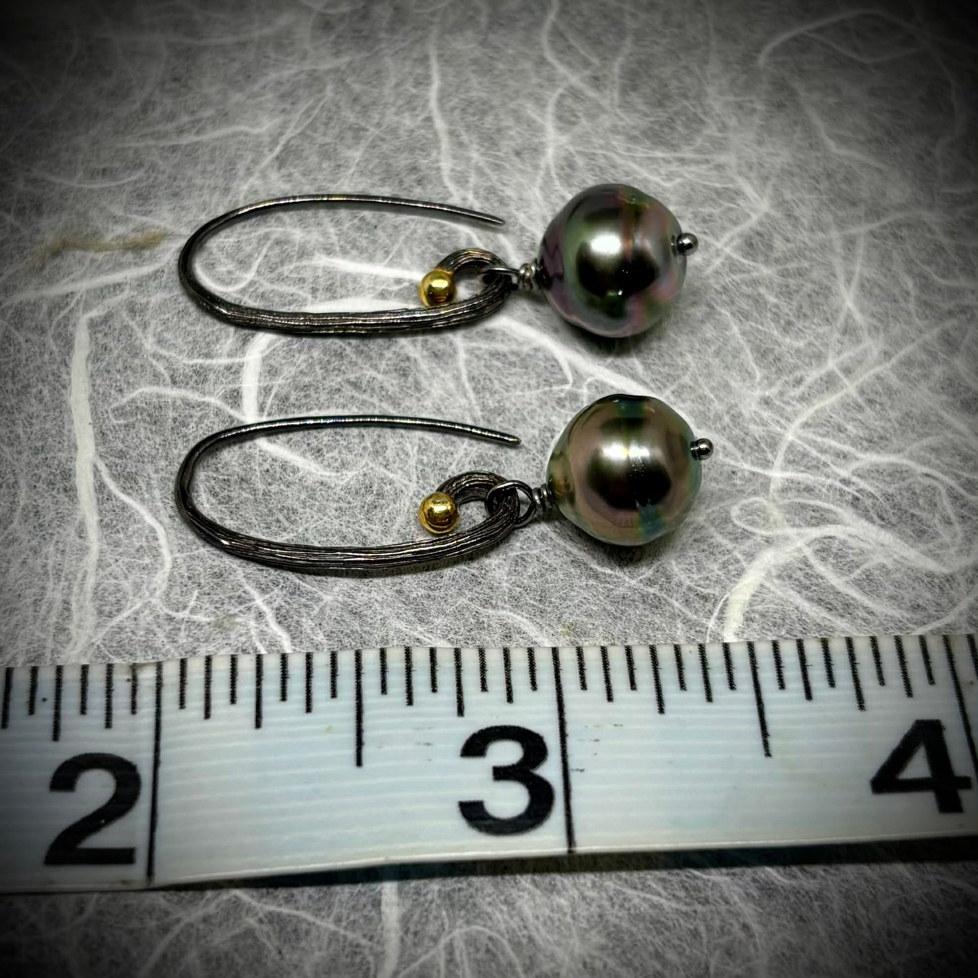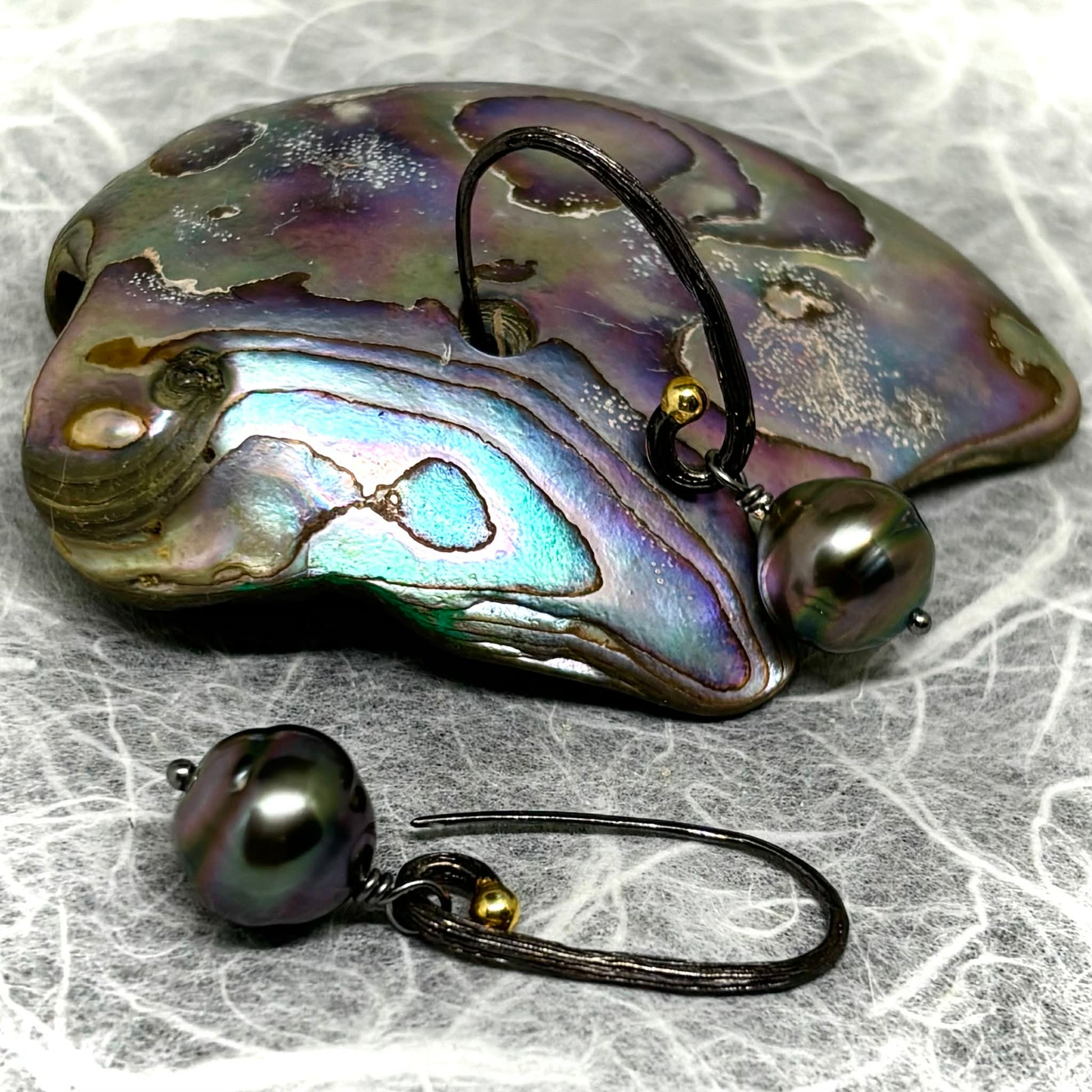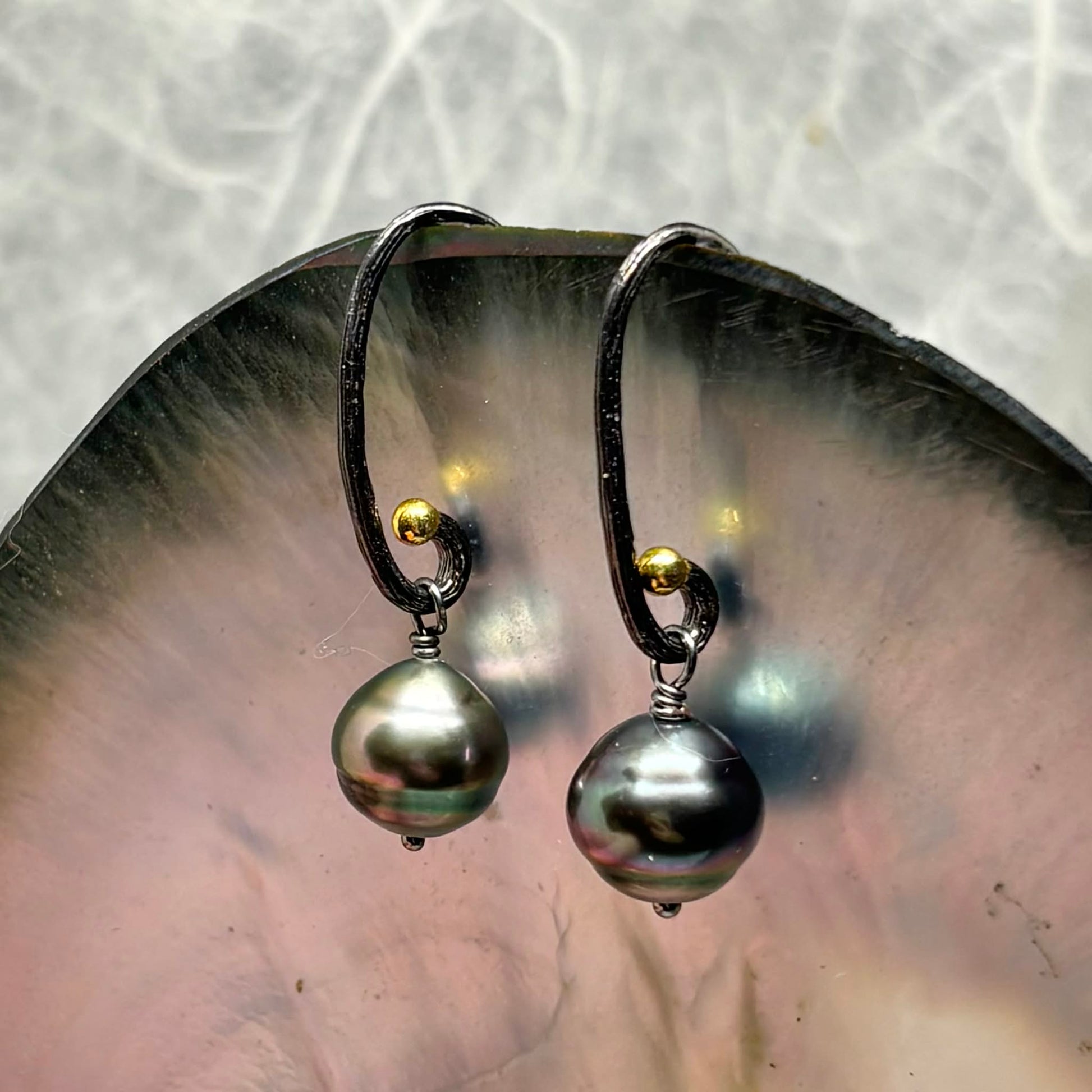 Experience the perfect balance of boho elegance and magic with our Black & Tahitian Delish hook earrings. Each pair features a wire-wrapped Tahitian pearl that dances with iridescent shimmer and a plated gold bubble for a touch of warmth. The high-luster surfaces and refined silver settings exude luxurious beauty without the high price tag. Add these earrings to your collection for a truly enchanting look.Add a touch of boho elegance and magic to your accessories with our Black & Tahitian Delish earrings. The blackened silver hooks, wire-wrapped Tahitian pearls, and gold-plated bubbles create a mesmerizing and luxurious look without the high price tag. Let the iridescent shimmer and high-luster surfaces catch the light for a hypnotic glow."