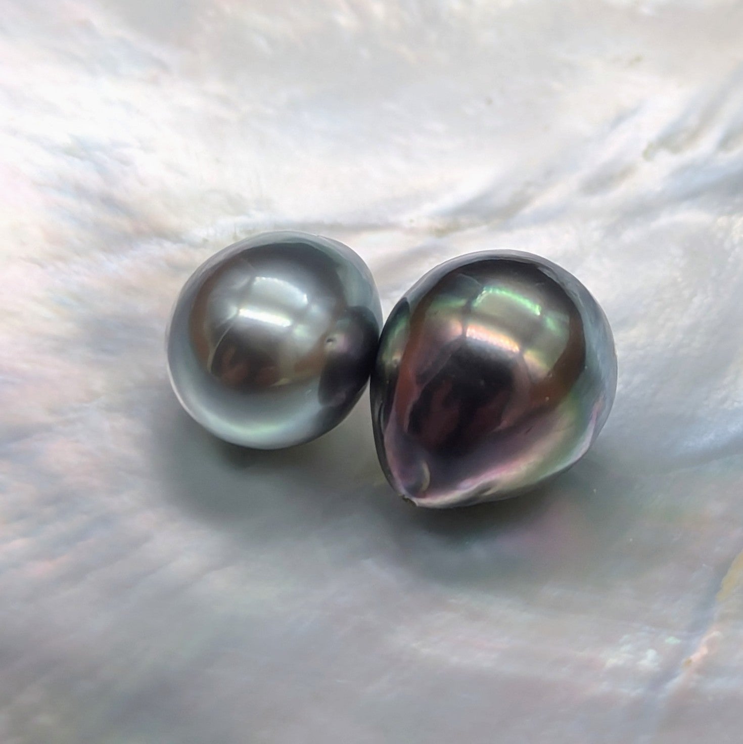 A pair of impeccably clean Tahitian drops available in medium silver grey or peacock hues, showcasing exceptional skin quality and luster—ideal for creating distinctive and striking jewelry designs.