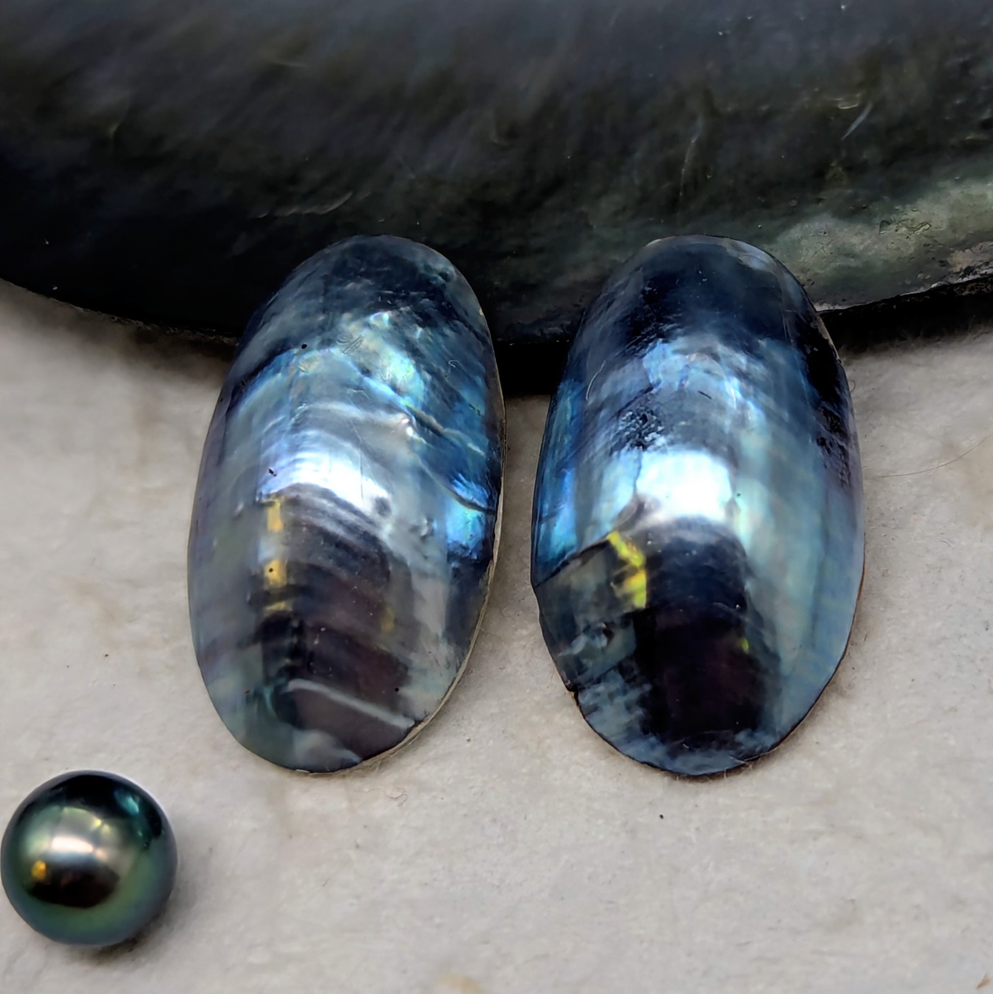 These striking nautilus cabochons showcase nature's most mesmerizing palette—a gradient of steel-blue melting into silvery grey, crowned with an intricate zebra-striped interior. At 17mm, this matched pair is tailor-made for creating show-stopping earrings or any symmetrical design that demands a touch of oceanic drama. Pure nautilus magic, ready to anchor your next jewelry masterpiece..