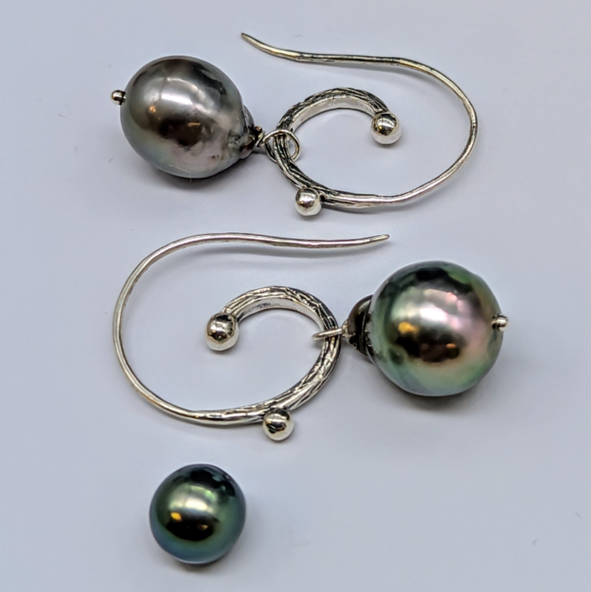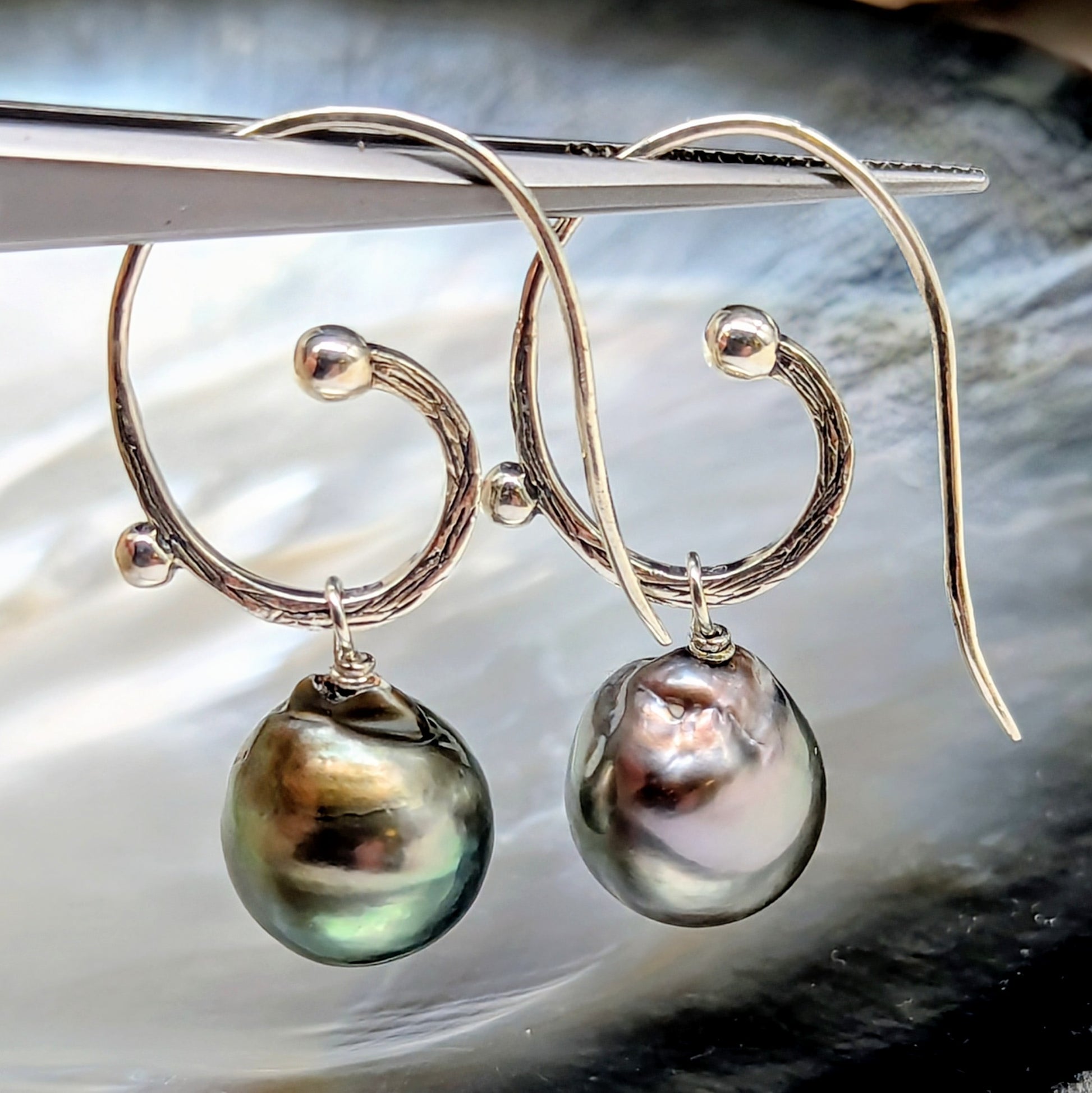 Slip into effortless elegance with these silver shepherd hook earrings featuring wire-wrapped peacock Tahitian pearls . The iridescent peacock green hue catches light beautifully, while the high luster creates that coveted luminous glow. Silver settings keep things refined yet undeniably cool.