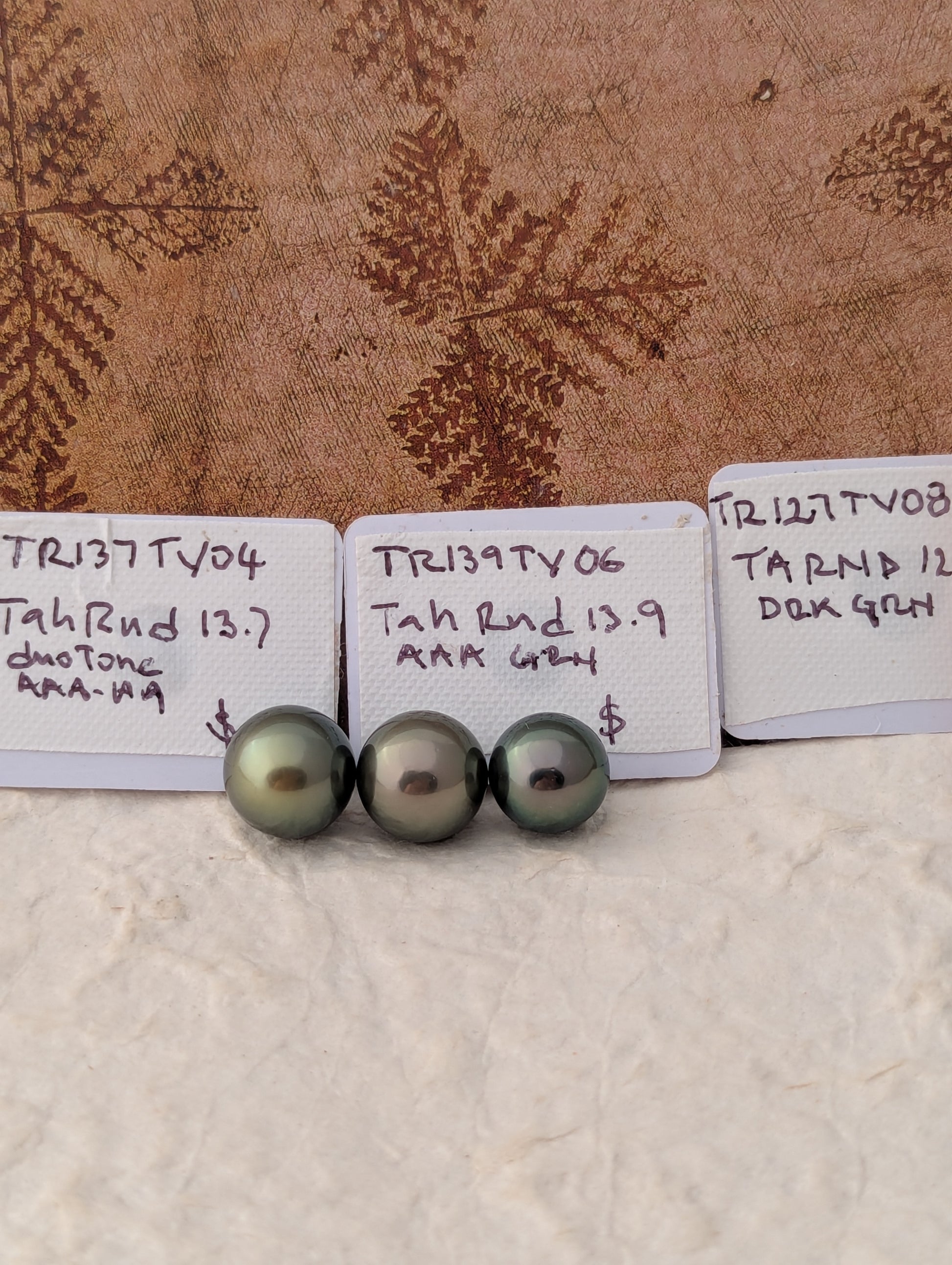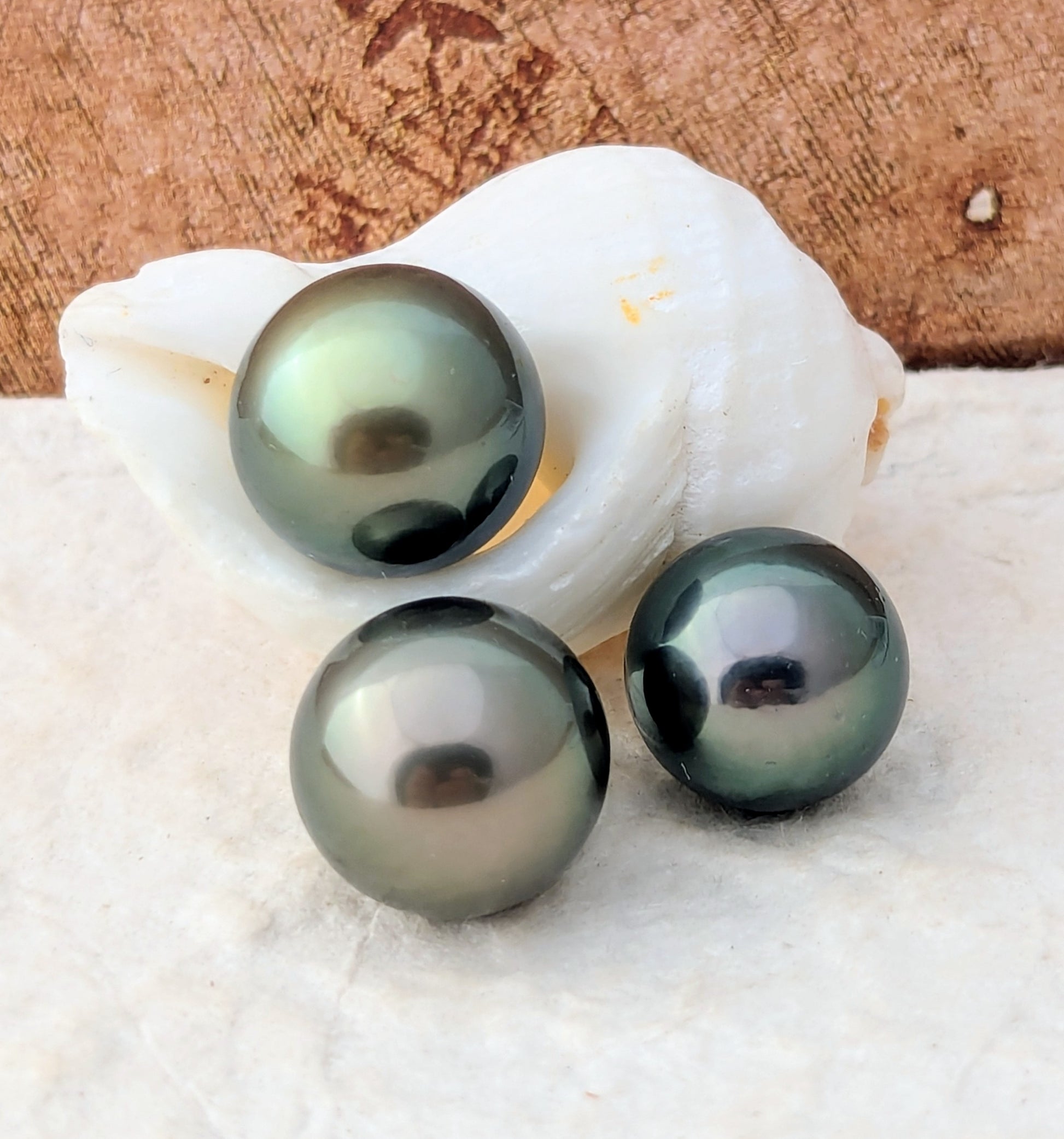 Three exceptional Tahitian pearls in one collection—each a showstopper. The star is a rare 13.7 mm duotone beauty in pistachio and grey that commands attention. Pair it with a lustrous 13.9 mm peacock overtone or the perfectly proportioned 12.7 mm peacock sibling. All round, all AAA-AA grade, all ready to elevate your next design. Pick your favorite or grab the whole trio.