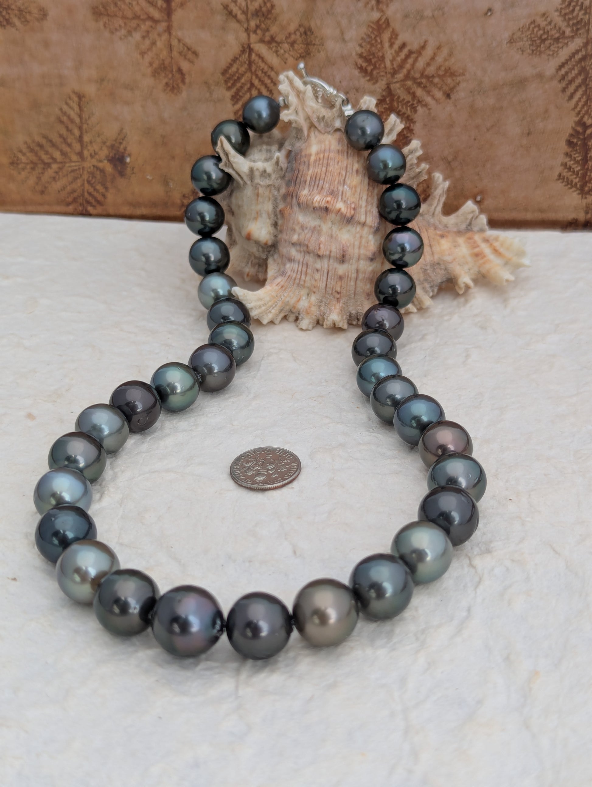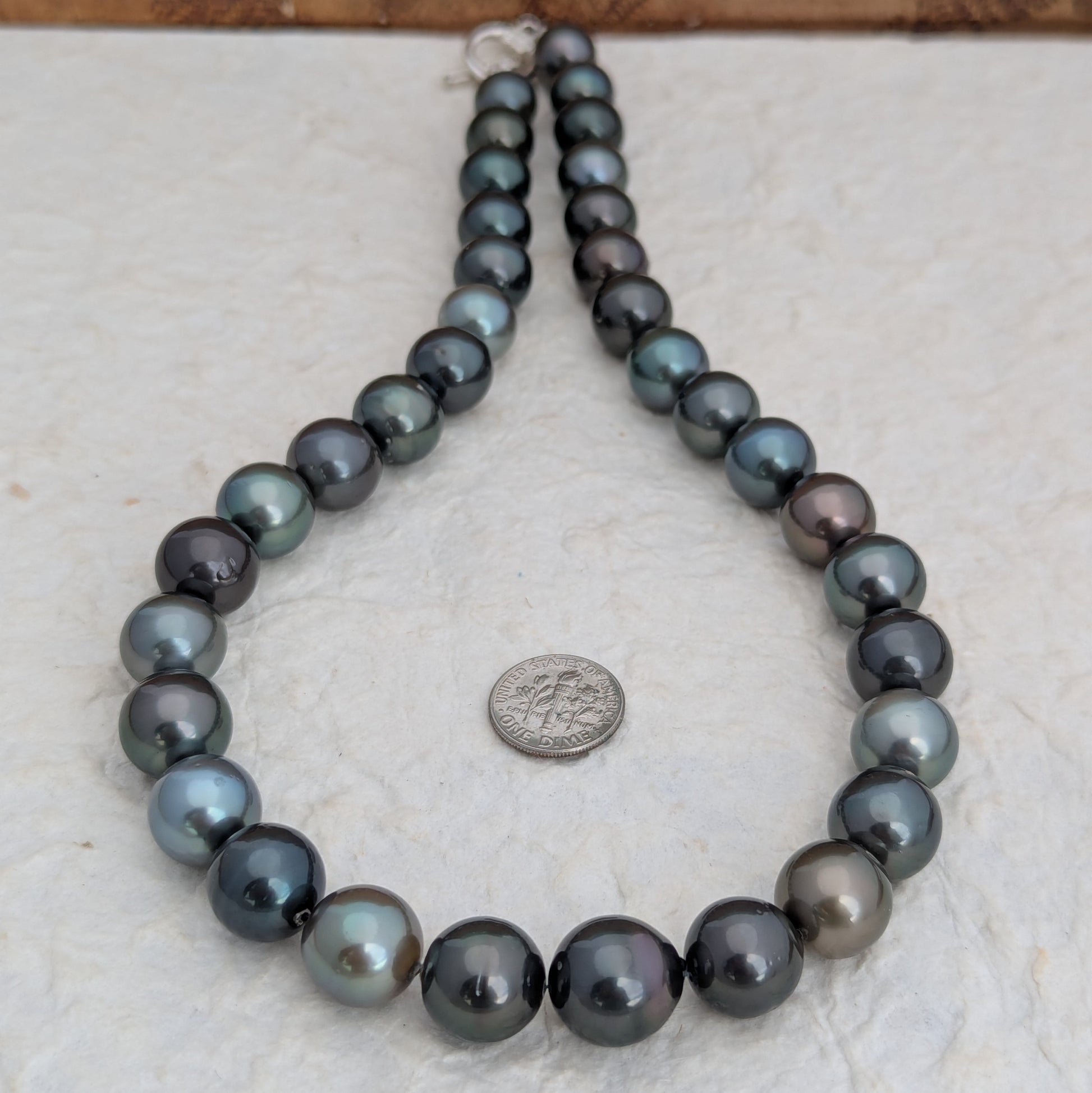 Thetis captures the essence of understated luxury. This 18-inch necklace showcases 37 premium large Tahitian pearls in multi color each measuring 12.7–13.7 mm with AA-grade luster and minimal natural variation. The interplay of semi round and oval shapes creates refined movement and depth. Precision-drilled and ready for your preferred clasp, it transitions seamlessly from day to evening wear. Sourced directly from origin, with the option to customize your finish.