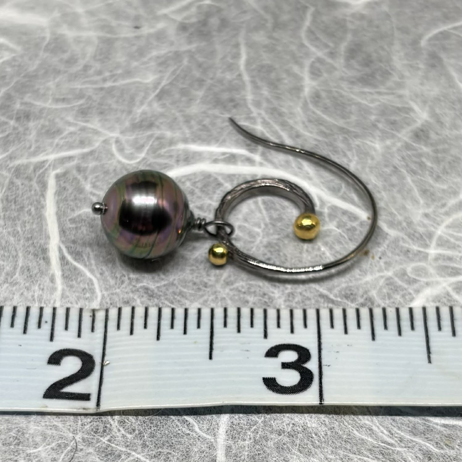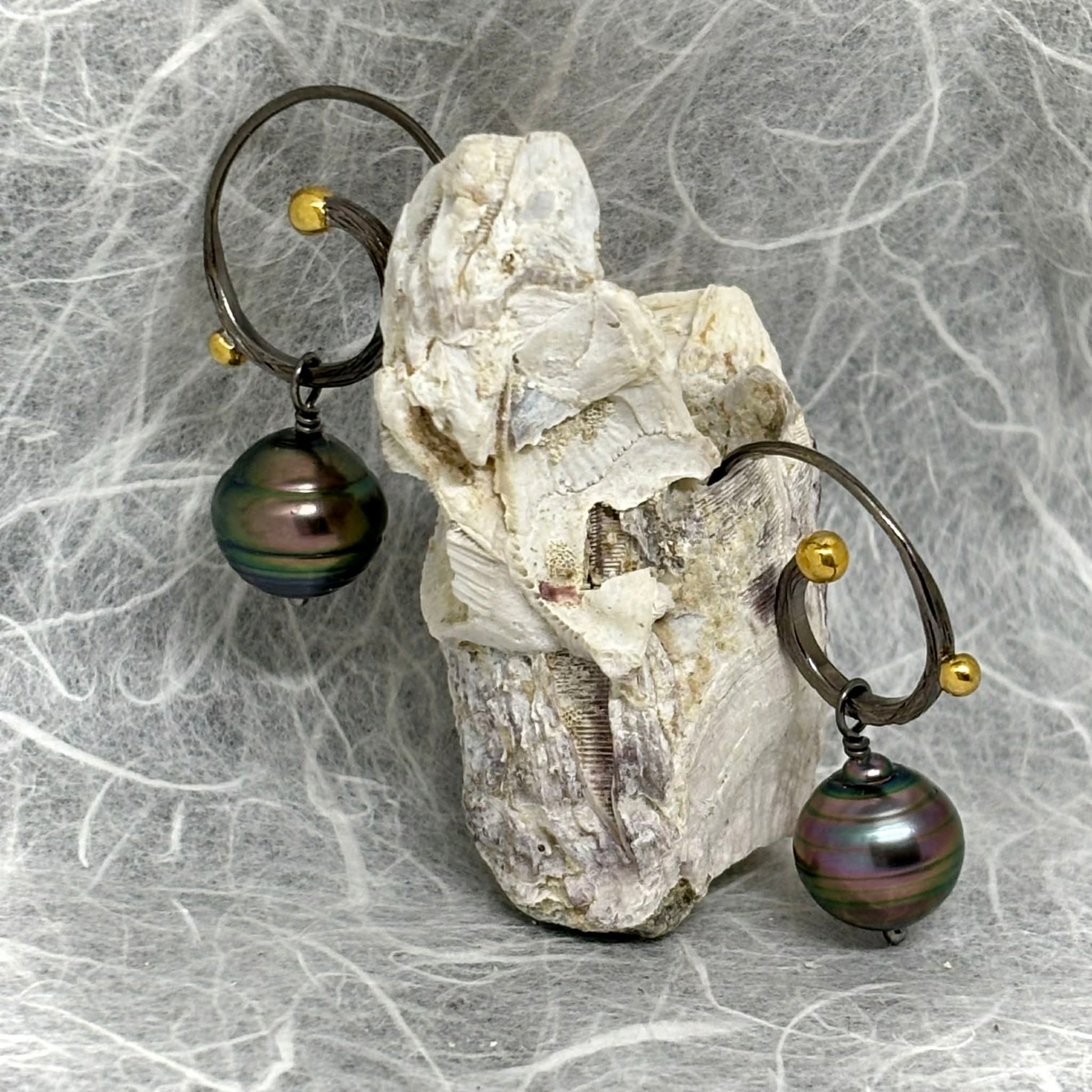 These blackened silver hook earrings strike the perfect balance between moody and magical. Wire-wrapped peacock 12 mm Tahitian pearls dance with iridescent shimmer, while plated gold bubbles add just the right touch of warmth. High-luster surfaces catch the light with an almost hypnotic glow, and the refined silver settings prove that luxury doesn't have to break the bank.