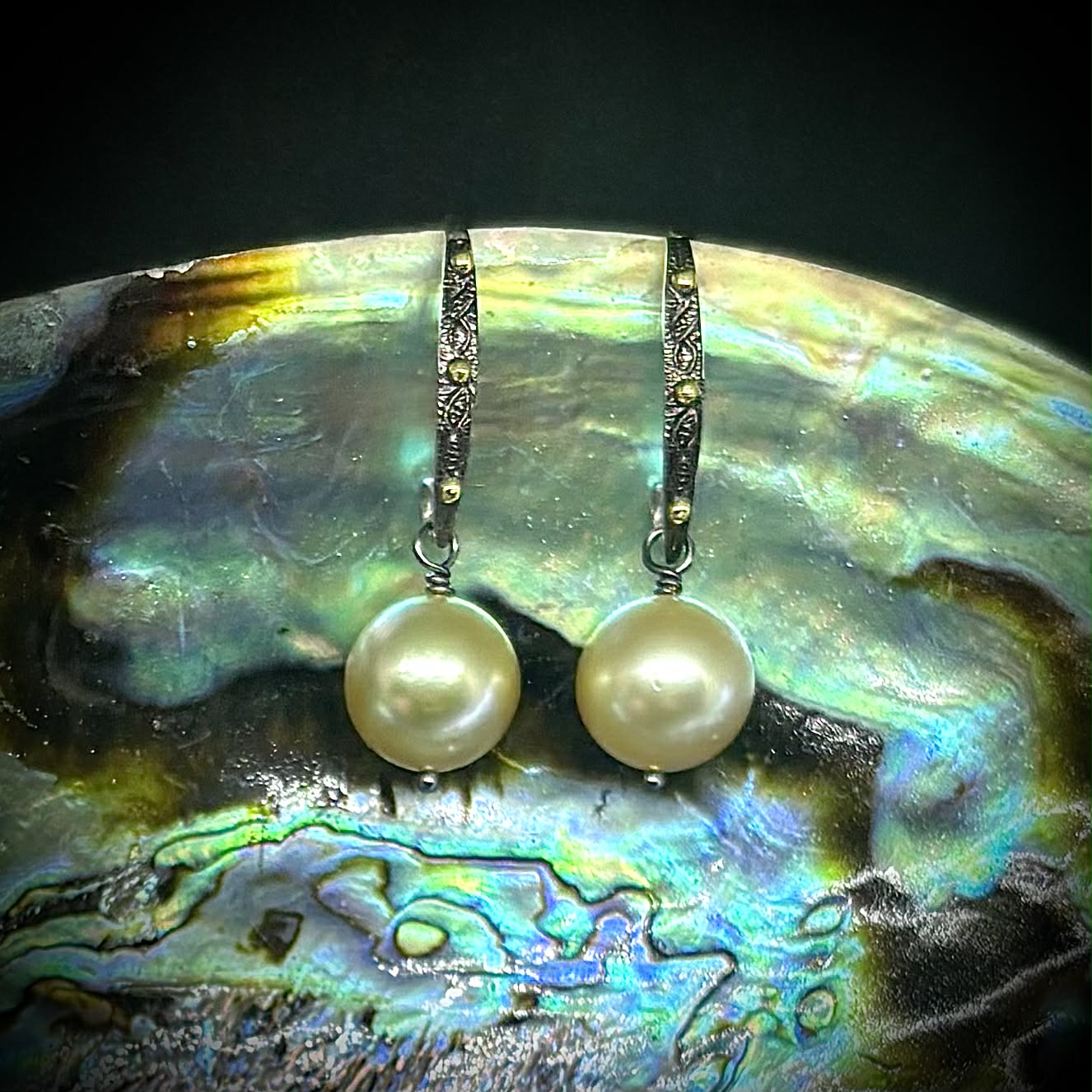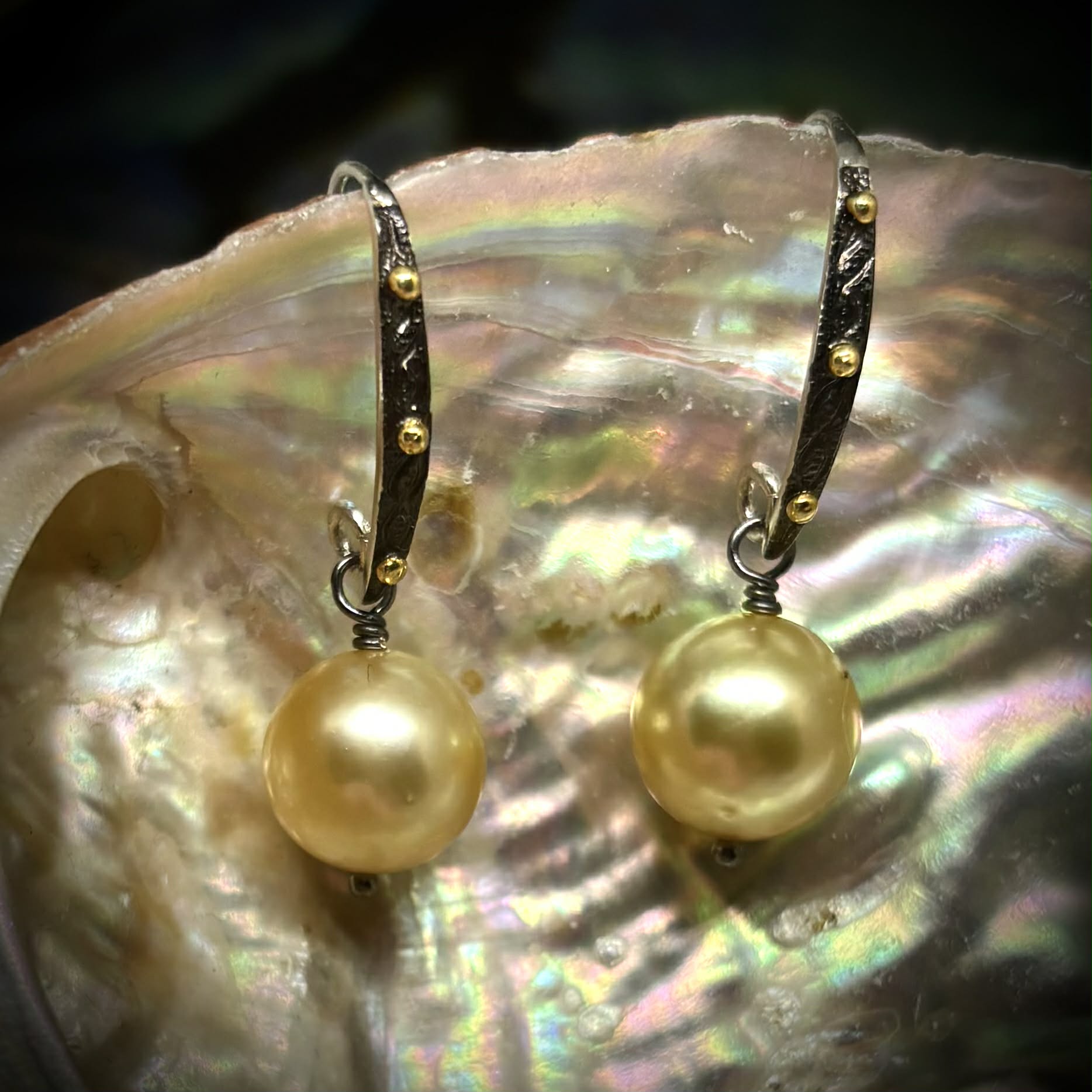 Dare to make a statement with these audacious earrings, where blackened silver hooks meet shimmering gold-plated accents that dance alongside lustrous 11mm South Sea gold pearls. The perfect blend of pirate-chic swagger and refined elegance, they're equally at home with your morning coffee or evening cocktail. Unapologetically bold, undeniably gorgeous—these pearls will quickly become your go-to treasure.