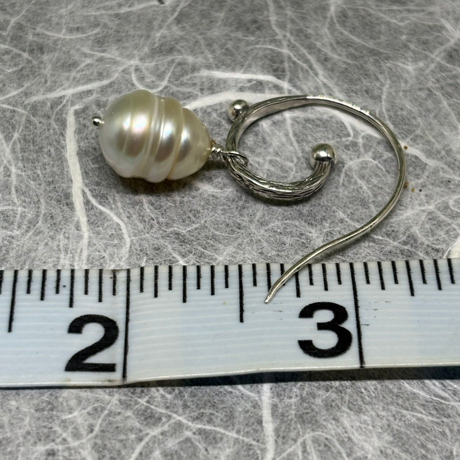 These textured silver hook earrings strike the perfect balance between moody and magical. Wire-wrapped South Sea circled pearls dance with moon-glow shimmer, while the silver bubbles add just the right touch of warmth. These 11 mm pearls catch the light with an almost hypnotic glow, and the refined silver s