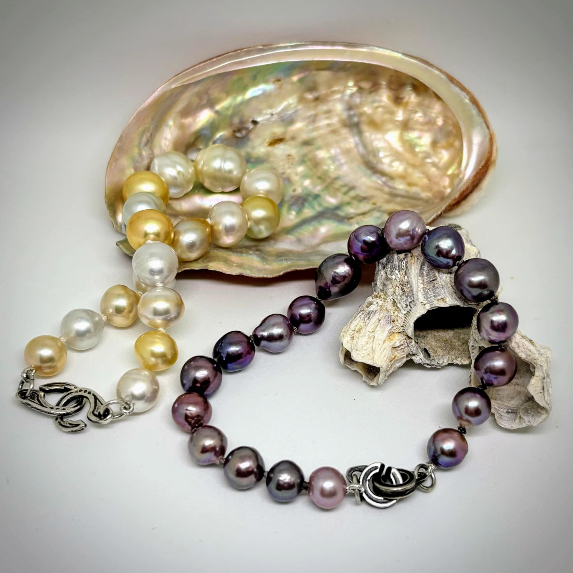 Setting type: Pearls are strung with grey silk and made super secured by our in house made silver Maori C clasp.