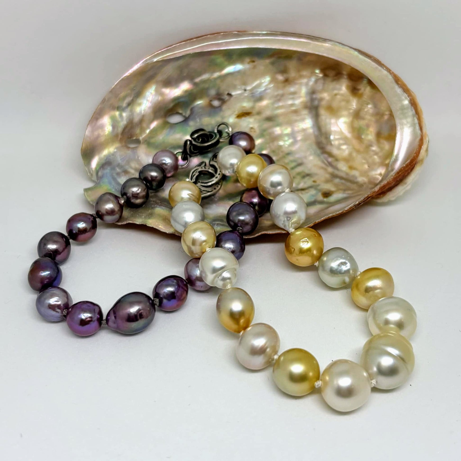 Explore the enchanting depths of the deep purple baroque pearls in this stunning bracelet. The natural coloring of the Edison Pearls is perfectly matched in a "purplish" fashion and secured with our unique oxidized C-clasp. Each pearl is a captivating world of its own ... that is unless you favor the sophistication of our Multi Ocean Bracelet, adorned with a variety of striking South Sea golden and champagne pearls, held in place by our exclusive maori fish hook C- clasp.