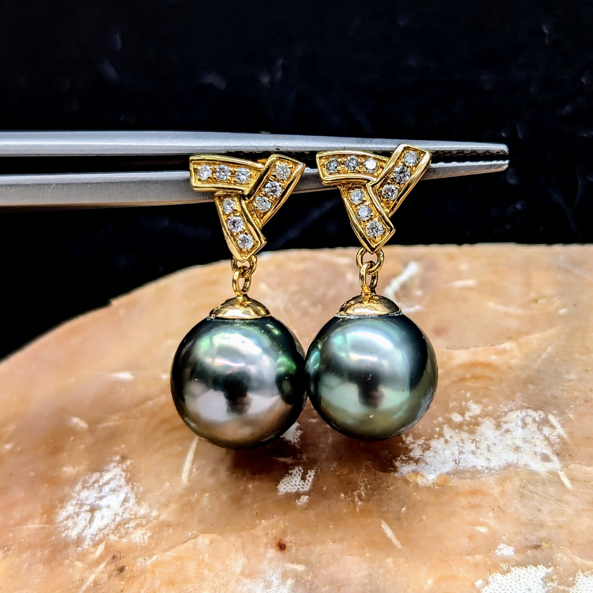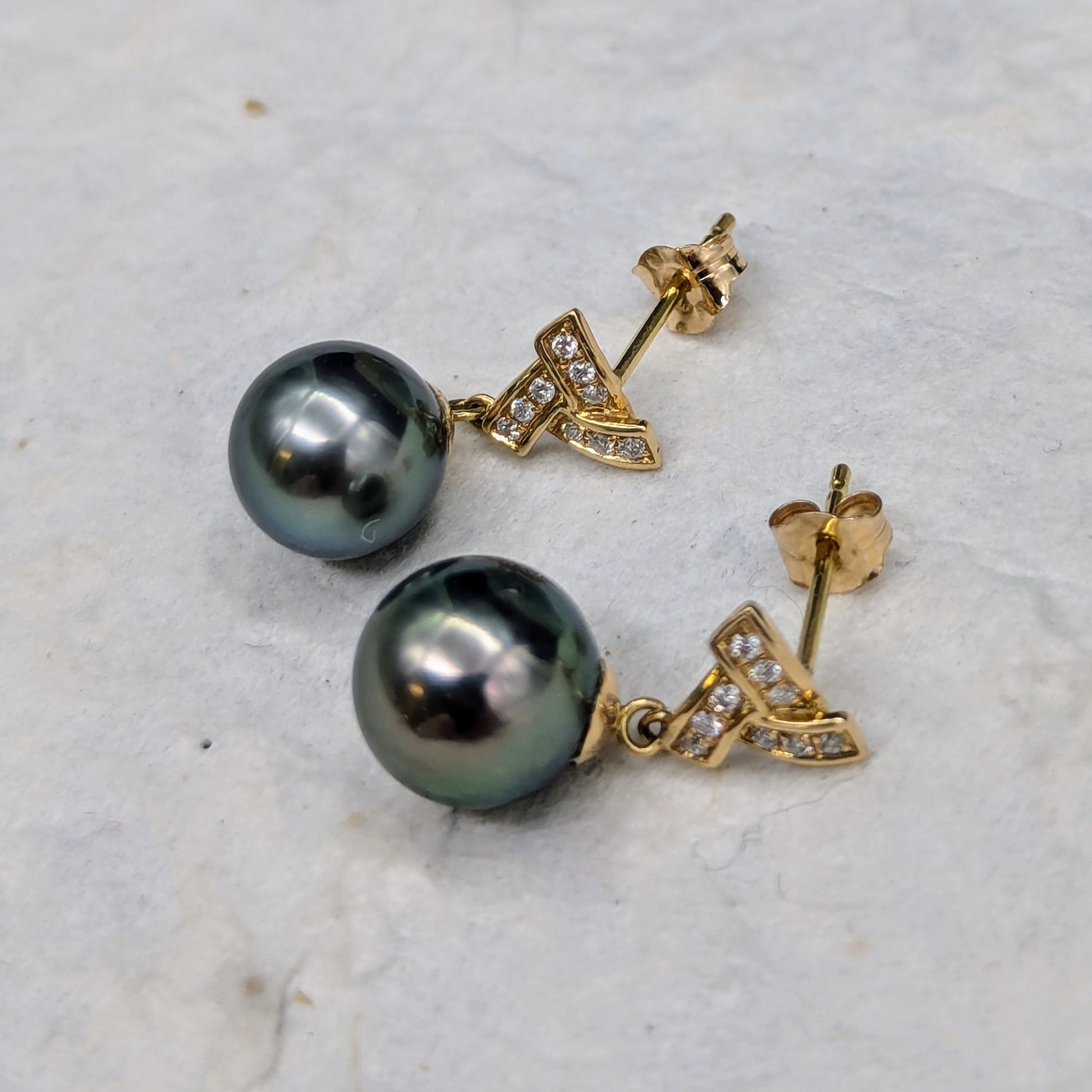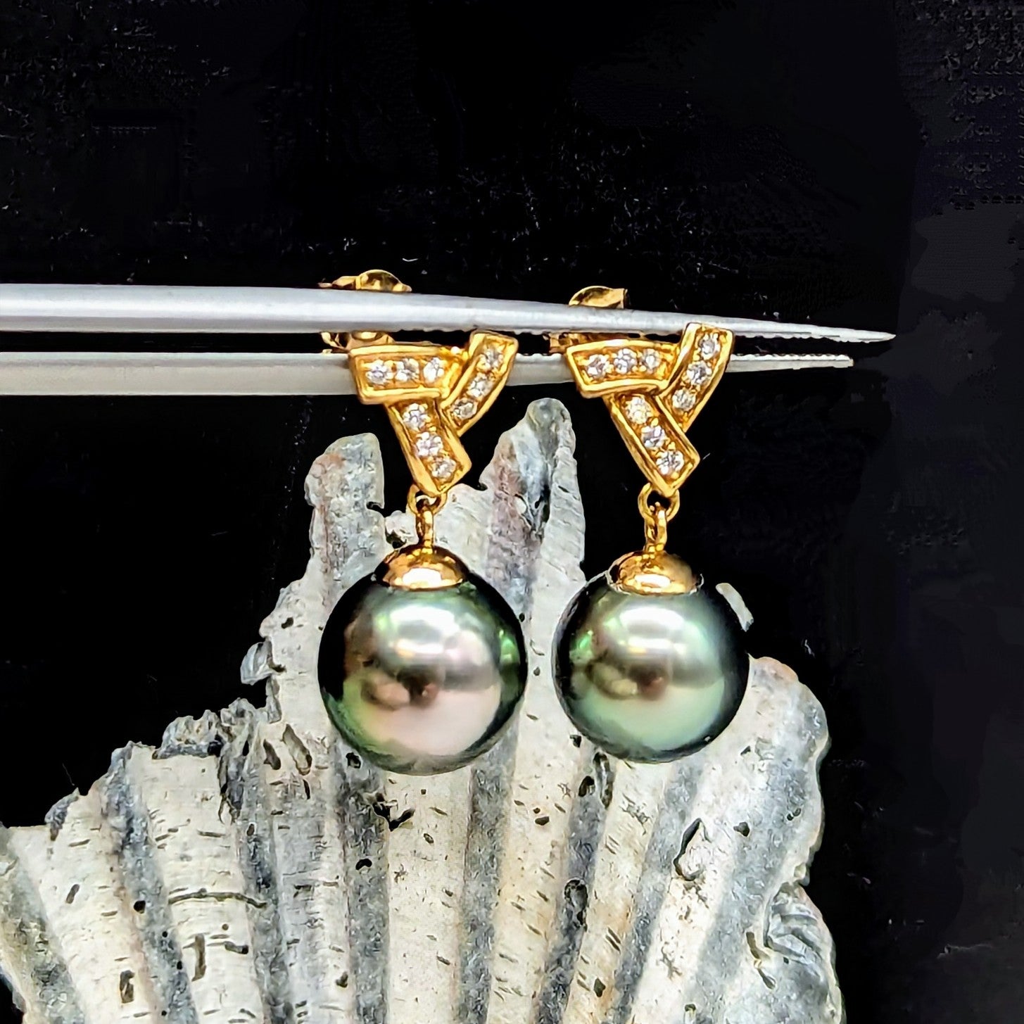 A very fine and luscious pair of 18k gold studs, diamonds and Tahitian peacock pearls.