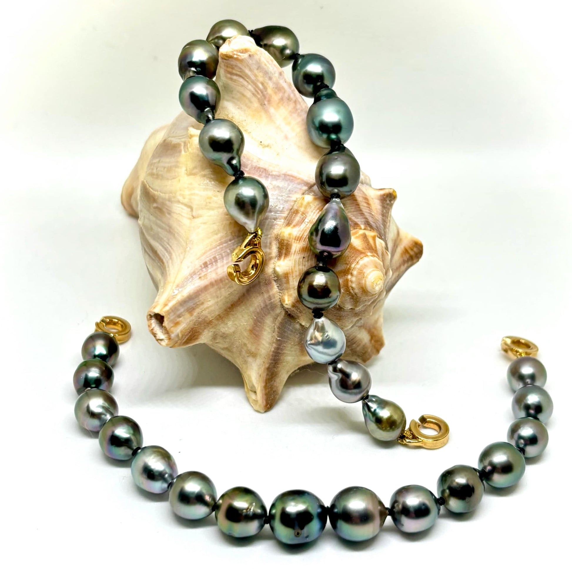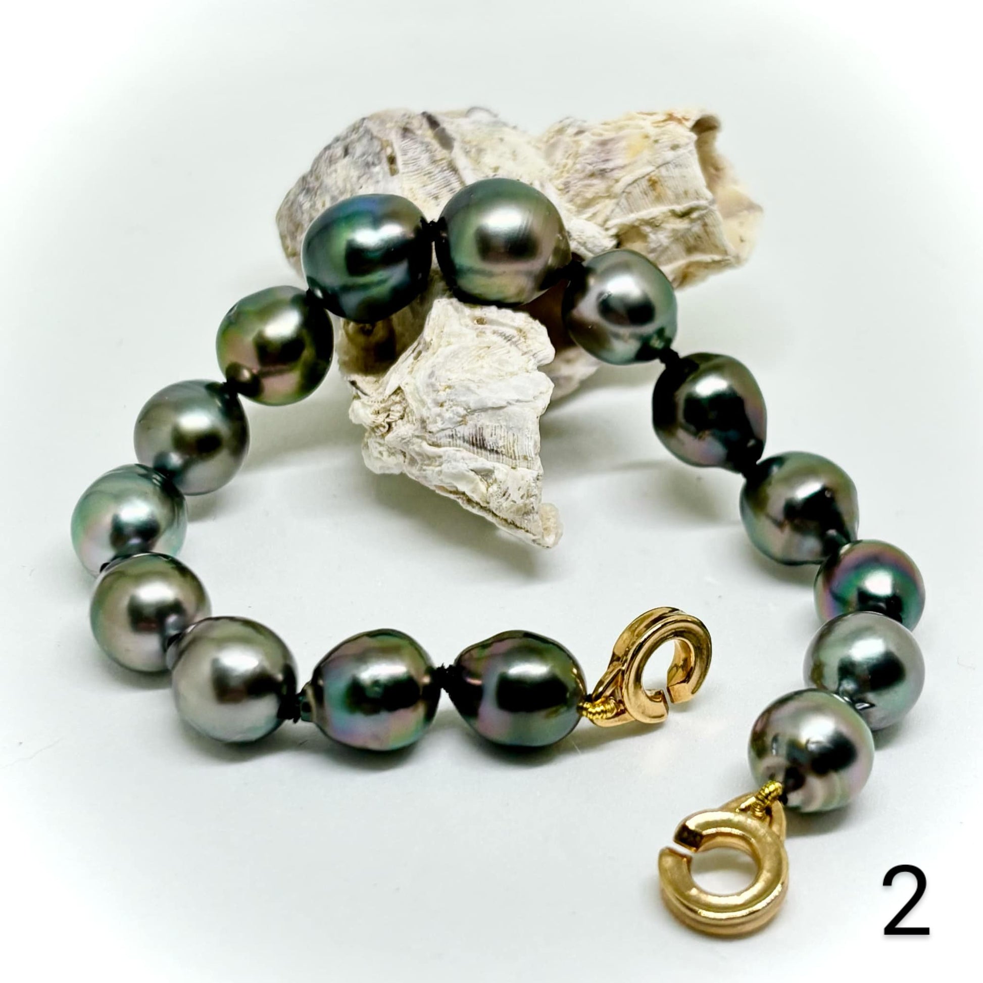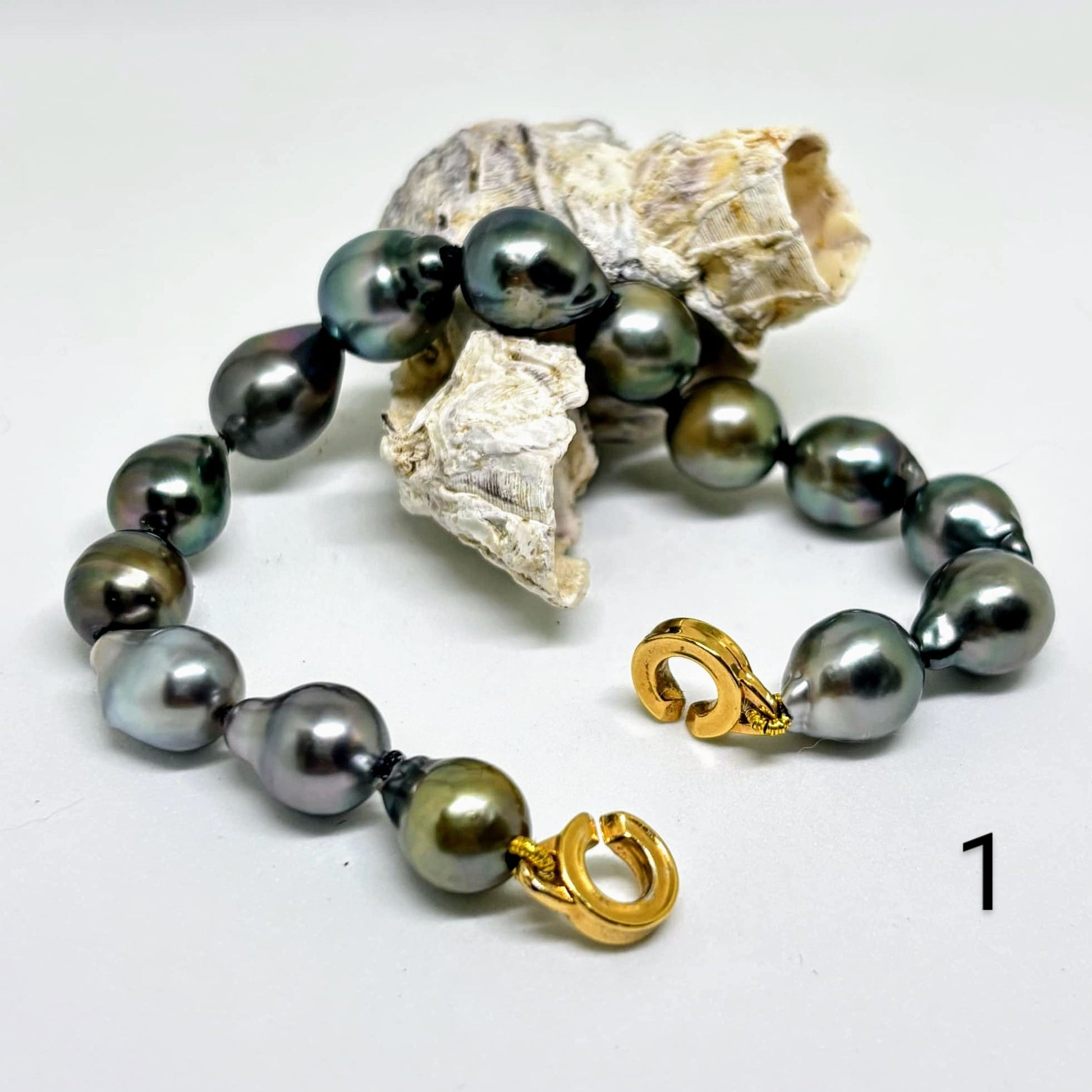Two colorful bracelets crafted with sexy semi baroque pearls , aesthetic Tahitian fashion! Each ocean jewel displays its own one-of-a-kind universe, shimmering with an enigmatic and beguiling aura..