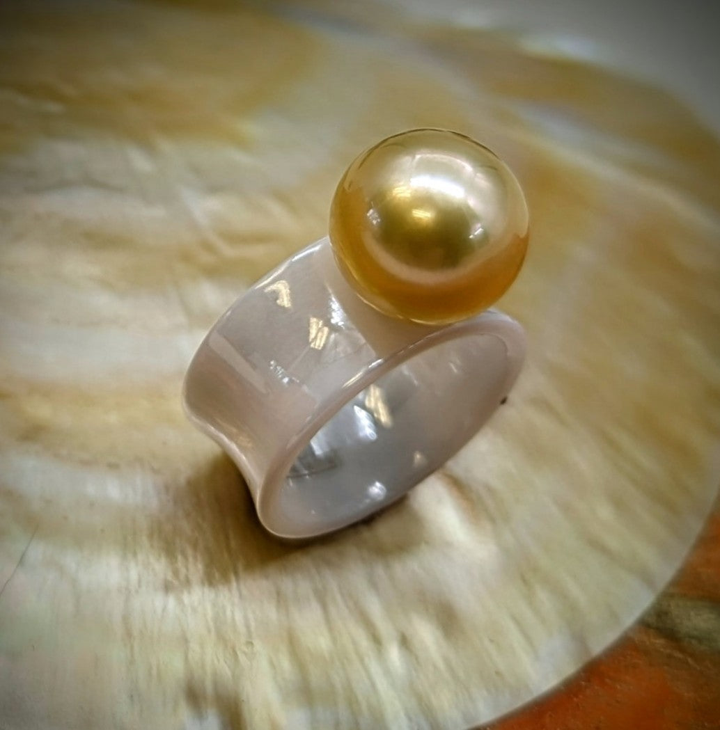 A glamorous South Sea Gold pearl on a white ceramic ring.