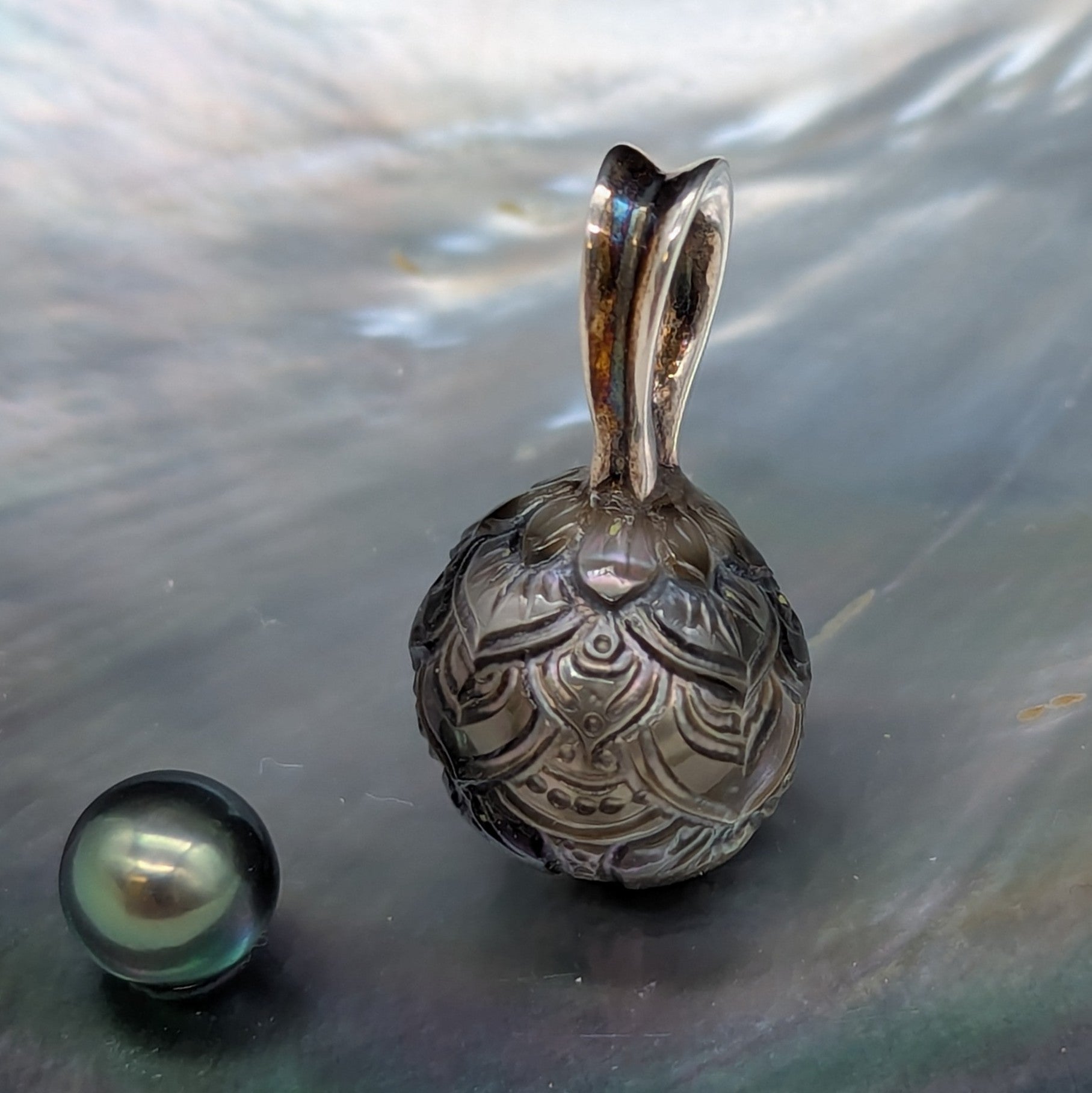 Expertly carved with a detailed Mandala, this large silver-grey Tahitian pearl is designed to enhance the wearer’s positive energy. The pearl is mounted on our exclusive, slightly oxidized silver bail, adding an authentic touch. This exquisite pendant features a 15 mm pearl steeped in meaning, gracefully suspended from a durable 3 mm black coil stainless steel chain, secured with a reliable bayonet clasp for both style and security.
