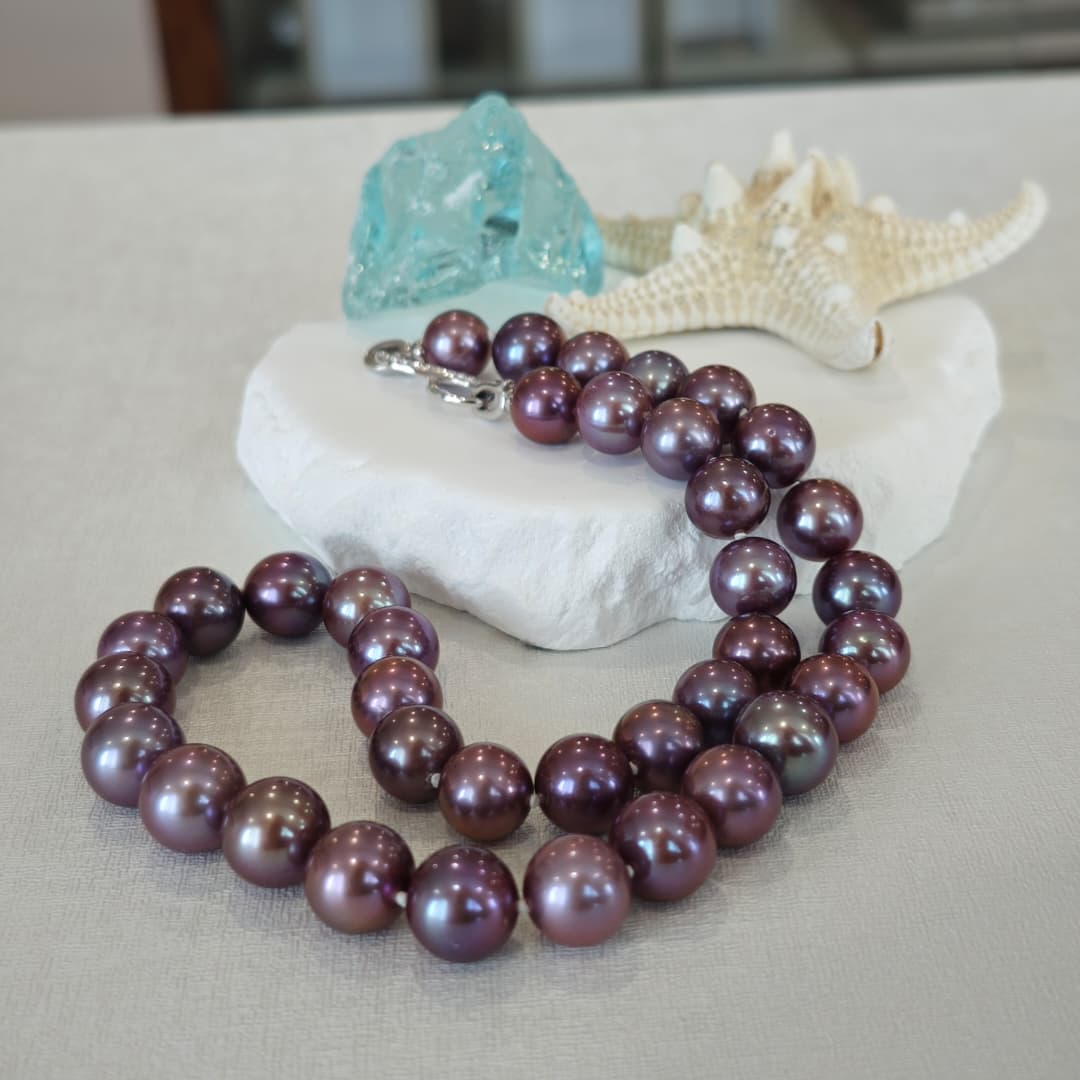 Discover the captivating allure of these exceptional round pearls, distinguished by their coveted purple match overtone and superior quality. Each lustrous gem displays remarkable brilliance and near-flawless surfaces, creating a necklace of refined sophistication. This collection embodies the timeless elegance and prestige worthy of royalty, offering a statement piece that transcends ordinary jewelry with its extraordinary beauty and craftsmanship.
